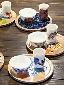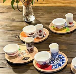 聞香杯と飲杯の図柄を揃えたり、あえて違えてみたり。トレーのデザインもひと工夫👍